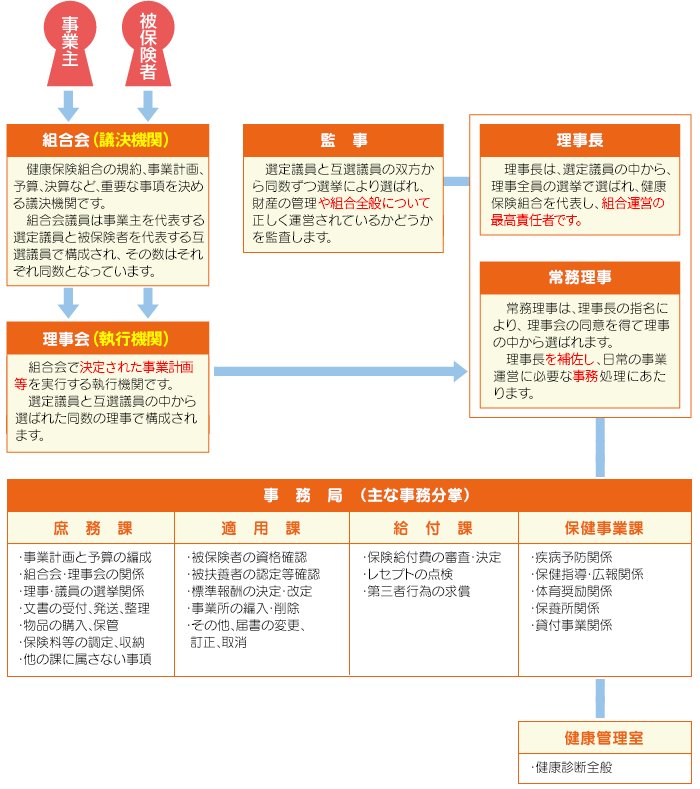 健康保険組合は、事業主側と被保険者の中から選ばれた同数の代表者によって「組合会」、「理事会」が設けられ、自主的 ・民主的に運営されます。
